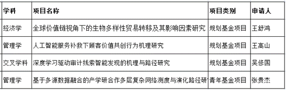 王舒鸿教授的全球价值链视角下的生物多样性贸易转移及其影响因素研究、王高山教授的人工智能服务补救下顾客价值共创行为机理研究、吴俢国副教授的深度学习驱动审计线索智能发现的机理与路径研究获规划基金项目立项,张贵杰教授(预聘制)的基于多源数据融合的产学研合作多层复杂网络测度与演化路径研究获青年基金项目立项。