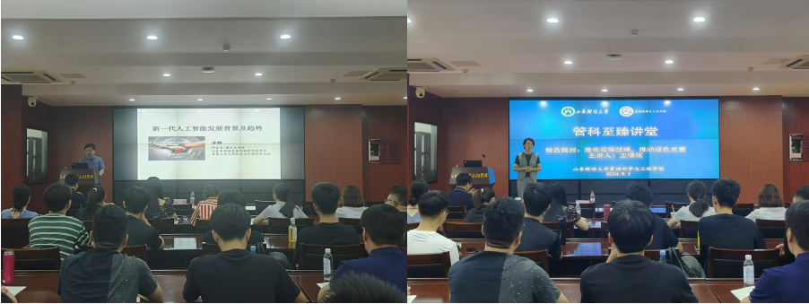9月1日上午,管理科学与工程学院在逸夫楼621举行了24级研究生迎新专题学术报告,邀请了山东财经大学中国国际低碳学院院长王璟珉教授和齐鲁工业大学经济与管理学部主任李晔研究员分别开展了“落实双碳战略,推动绿色发展”和“新一代人工智能发展背景及趋势”的学术报告。报告会由副院长刘政敏教授主持,学院师生50余人参加了报告会。