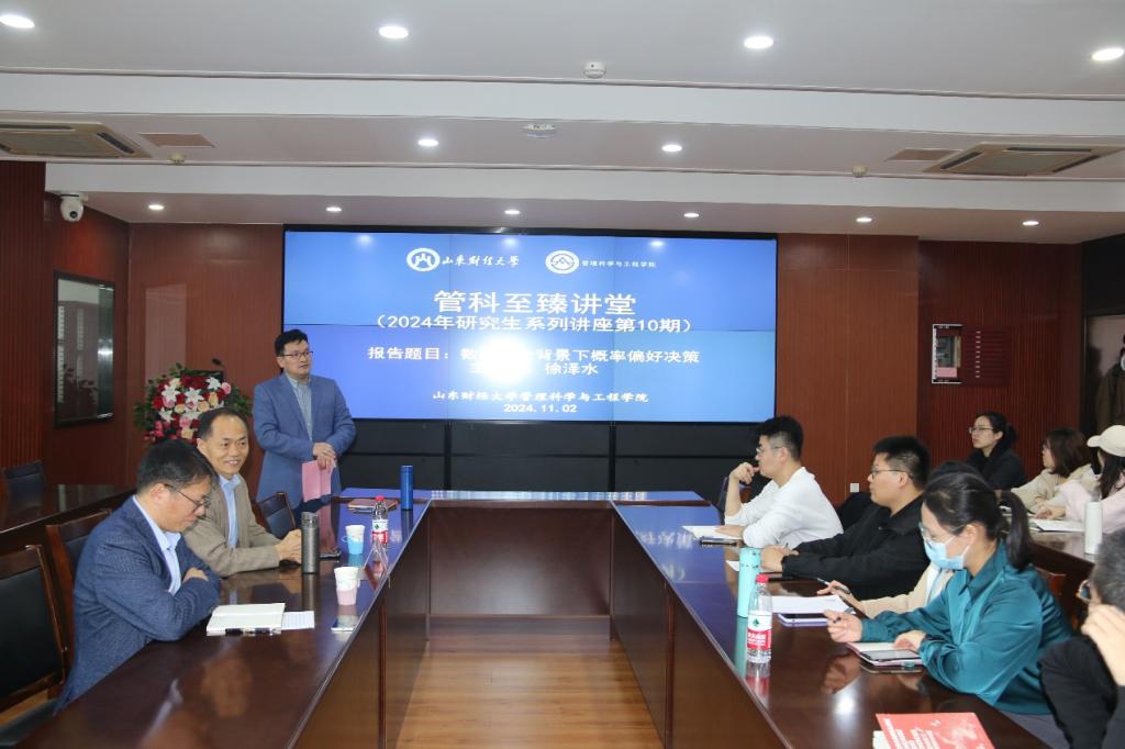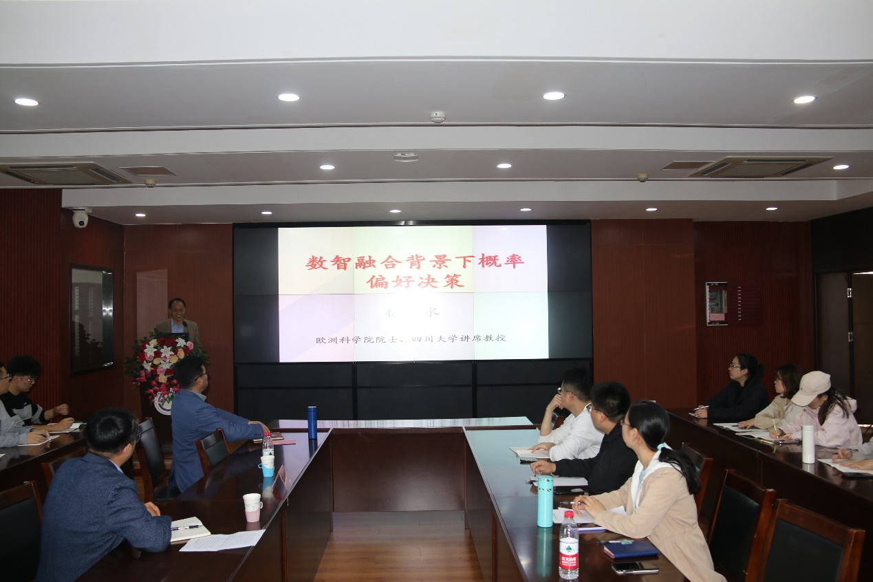 2024年11月2日,四川大学讲席教授、欧洲科学院院士、欧洲科学与艺术院院士、国际系统与控制科学院院士、长江学者特聘教授、国家杰出青年科学基金获得者徐泽水教授莅临我院作了“数智融合背景下概率偏好决策”专题讲座。本次讲座由院长刘位龙教授主持,刘培德教授、副院长刘政敏教授以及学院部分师生参加了本次讲座。
