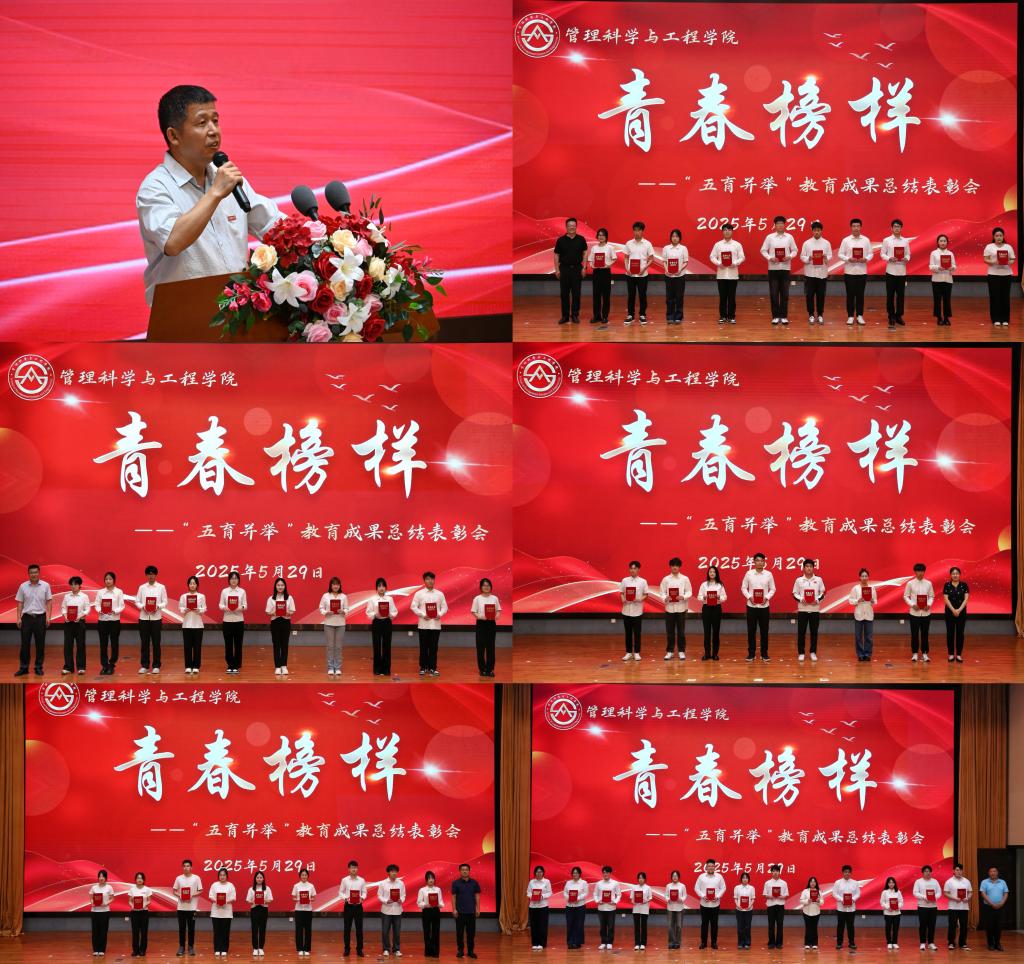 学院党委副书记刘思锋宣读《管理科学与工程学院关于表彰2024-2025学年青春榜样的决定》后,按照德育、智育、体育、美育、劳动教育五个类型,依次展示了2024-2025学年各类型“最具影响力集体”和“年度人物”的风采,被表彰集体的事迹或故事以及被表彰个人的成绩和精神,深深打动在场每一位老师和同学的心,也充分展示了学院扎实推动“三全育人”、推动学生全面发展的教育成效。各职能部门到场嘉宾为获奖集体和个人进行了颁奖。
