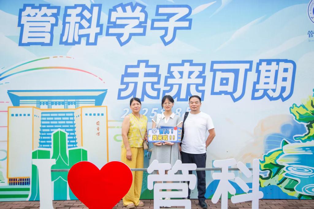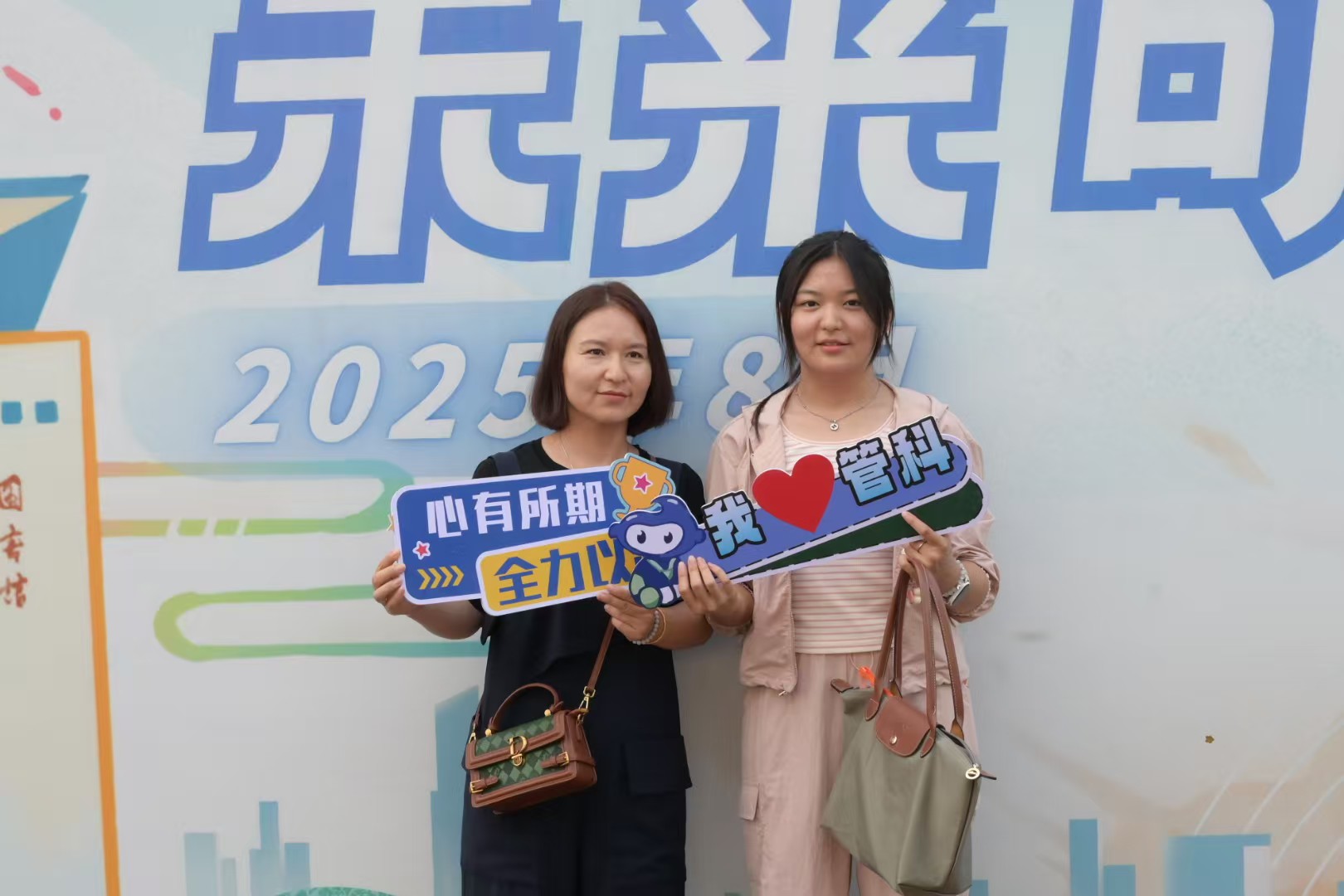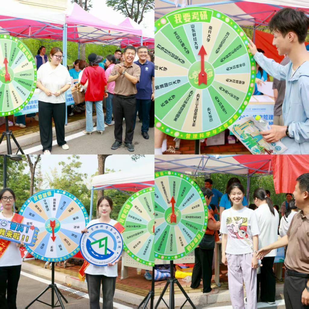 迎新点旁的互动转盘活动格外吸睛,“我要就业”“我要考研”两大主题转盘前人头攒动,新生们纷纷转动转盘,寄托对未来的规划与期许,现场氛围热烈。其中一位新生的家庭引人关注——她的父母均为山东财经大学校友,此次陪同女儿报到,既是送孩子开启新旅程,也是重回母校重温青春记忆。