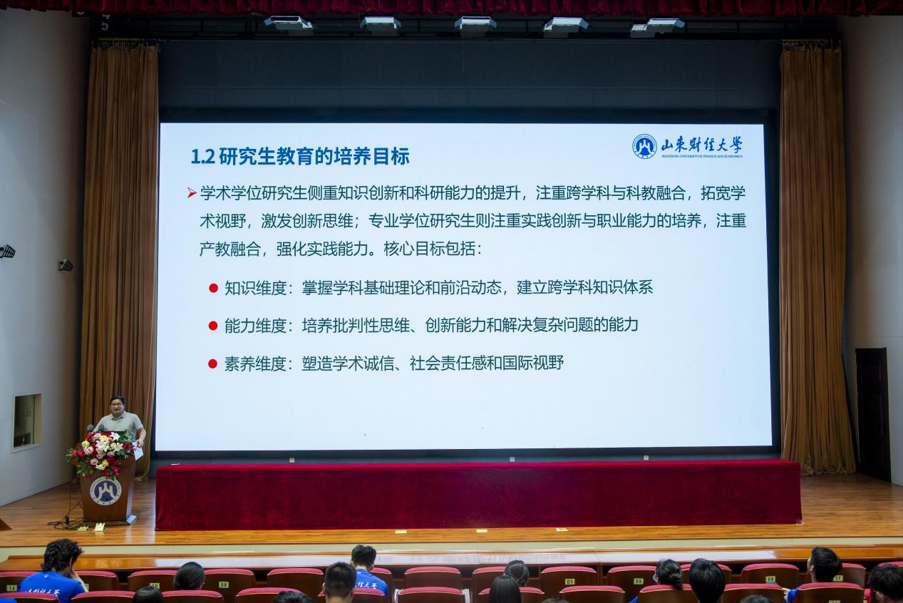 9月6日,章丘校区图书馆报告厅内座无虚席,学院院长刘位龙教授以《锚定人生方向 引领未来发展》为题,为2025级全体研究生讲授了入学第一课。讲座紧密结合研究生阶段的学习特点与成长需求,从学科认知、能力构建、学术规范到资源利用,为新生们搭建起清晰的成长框架,提供了兼具理论深度与实践价值的指导。