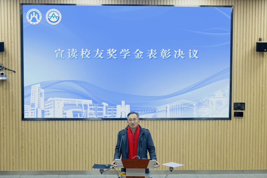副会长刘波宣读《管理科学与工程学院校友奖学金2025年秋季表彰决议》,对2025年参加国家级比赛取得第一等级的五个团队进行表彰。