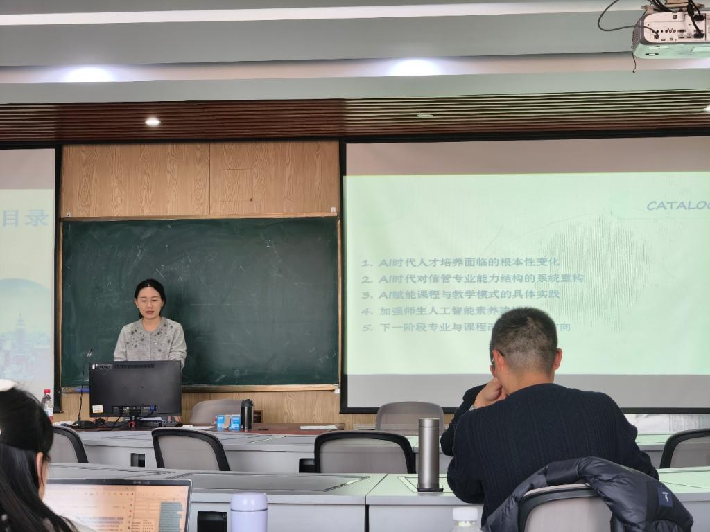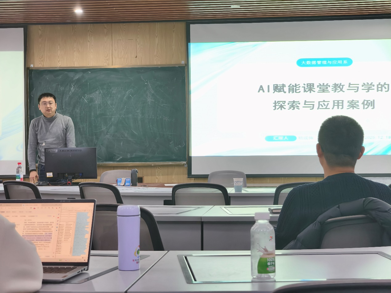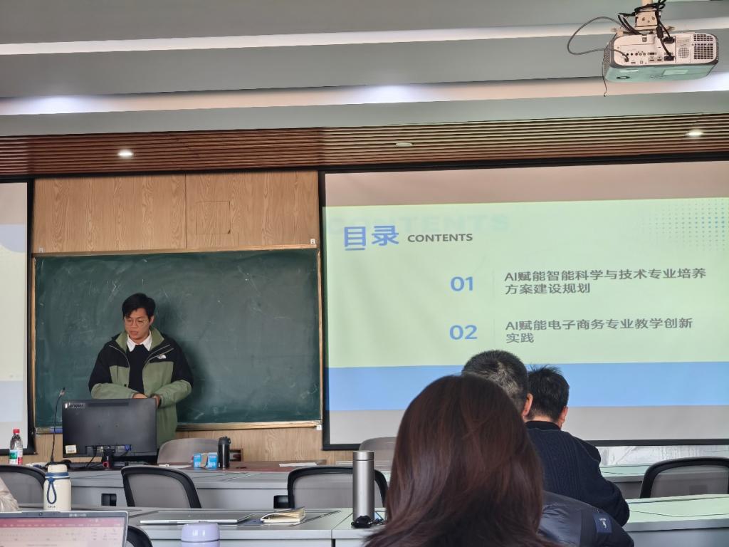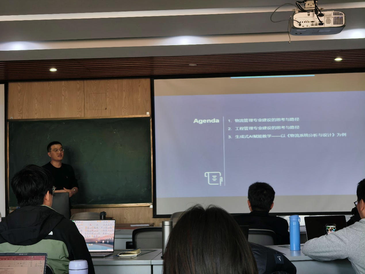 研讨环节,多位教师围绕不同专业领域和核心课程,展开了专题报告。吴双老师聚焦信息管理与信息系统专业,分享了AI赋能专业定位优化与课程体系重构的探索实践;杨成伟老师针对大数据管理与应用专业,探讨了AI技术在数据处理、分析教学中的融合路径;李佳路老师则围绕物流管理、工程管理两个专业,提出了AI赋能实践教学场景拓展的具体方案;李慧宇老师结合智能科学与技术、电子商务专业特色,阐述了跨学科融合视角下的AI教学创新思路。