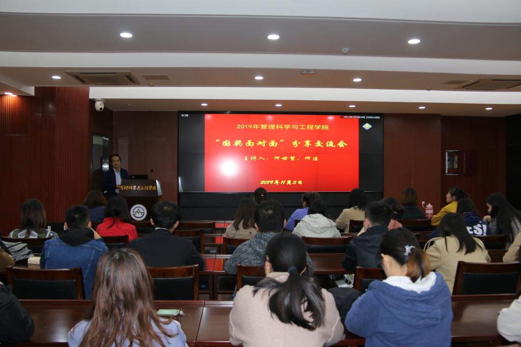 为拓宽研究生学术视野,促进朋辈交流互助,发挥榜样引领作用,11月5日下午,学院在逸夫楼621举办“国奖面对面”经验分享交流会。本次交流会邀请了2019年国家奖学金获得者何世繁、何洁两位同学担任主讲,博士生导师关洪军教授担任点评专家,党委副书记朱翠珍主持,2019级全体研究生参加了此次活动。