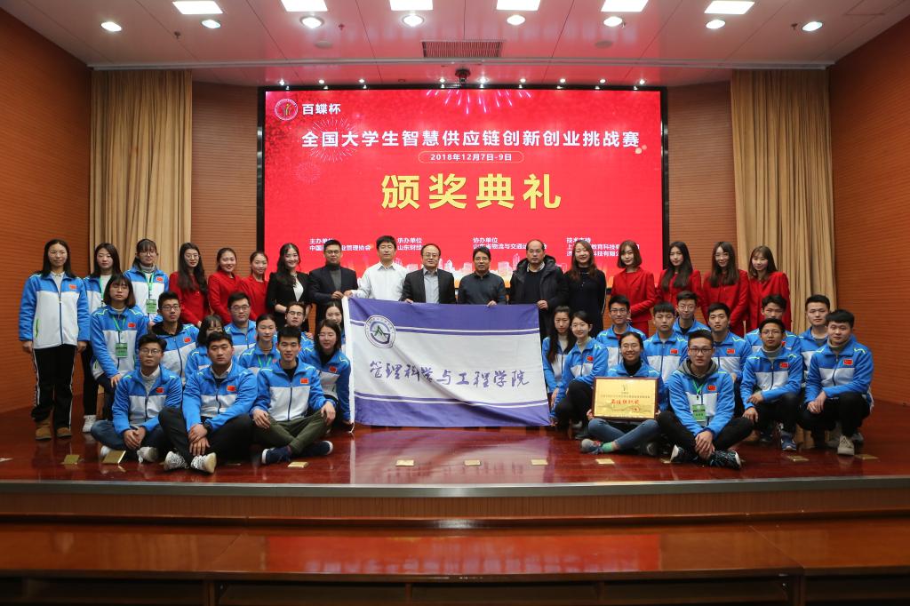 12月8日、9日,“2018百蝶杯全国大学生智慧供应链创新创业挑战赛”在我院成功举办,经激烈角逐,最终,我院陈爱玲指导,温克寒、韩铭志、张晓聪、张春燕同学组成的“赛百队”及来自中国海洋大学、南京审计学院的总计4支团队获本科组特等奖,我院聂彤彤老师指导,何宇晴、王肇阳、王昊龙、孙逍组成的“走心小卖家队”及来自东北石油大学等的7支团队获一等奖,其他奖项也各得其主。中国商业企业管理协会副会长郑天舒、我校副校长张新出席了大赛开幕仪式并致辞,中国商业经济学会秘书长张明泽出席了闭幕式并致闭幕辞。
