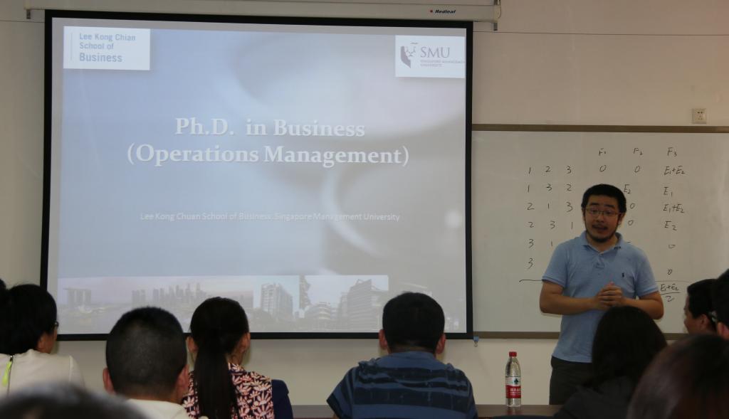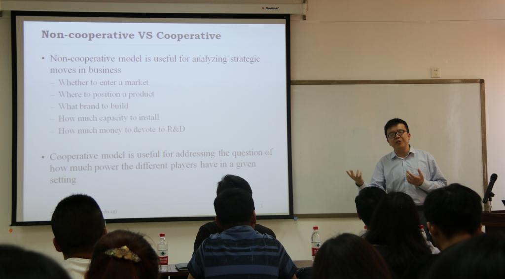 方心博士作了题为“Competition and Cooperation in Global Supply Chain Networks”的报告。他首先介绍了合作博弈的理论基础,以串货问题中的利润分配为例重点讲解了Shapley值在运营管理中的应用;然后与大家分享了基于网络结构的合作博弈的相关理论成果;最后探讨了将合作博弈和非合作博弈结合在一起的混合模式。王宇博士以“新加坡大学研究生培养及国外大学申请经验分享”为题,介绍了新加坡管理大学的历史和现状,以及博士研究生的招生和培养,并与师生们分享了国外大学申请经验。报告结束后,方心博士和王宇博士与现场师生进行了互动,并针对相关提问做出了详细解答。