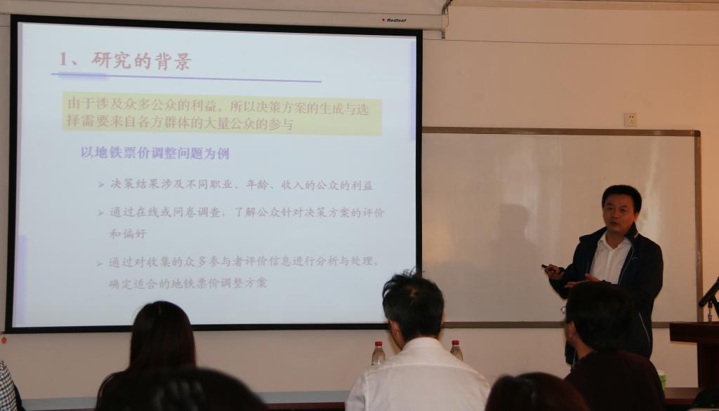 刘洋副教授针对现实中由多个群体组成的大群体决策方法做了系统讲解。他首先介绍了大群体决策方法的研究背景,指出传统群决策和大数据下的大群体决策之间的区别,并介绍了2种大群体决策方法:一种是基于百分比分布评估信息、主客观结合的权重确定方法和PROMETHEEII排序的大群体决策方法;一种是考虑公平性度量的大群体决策方法。