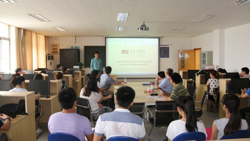 张中举教授在报告中介绍了其最新研究成果,重点讲述了如何设计一个有效系统抽取知识社区中的文本特征,以及利用特征集对知识社区中提供的解决方案进行有用性分类/分级,并详细讲解了如何从设计科学视角研究信息系统领域中有关问题。他还介绍了亚利桑那州立大学凯利商学院的信息管理、供应链管理等学科建设情况,鼓励硕士研究生报考商学院的博士。