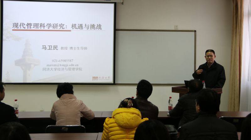 12月7日,同济大学经济与管理学院马卫民教授莅临管科论坛,做了题为“现代管理科学研究——机遇与挑战”的学术报告。张新院长主持报告会并简要介绍了马卫民教授的学术研究情况。我院及其他兄弟学院部分教师、博士生、硕士生共约40人参加报告会。