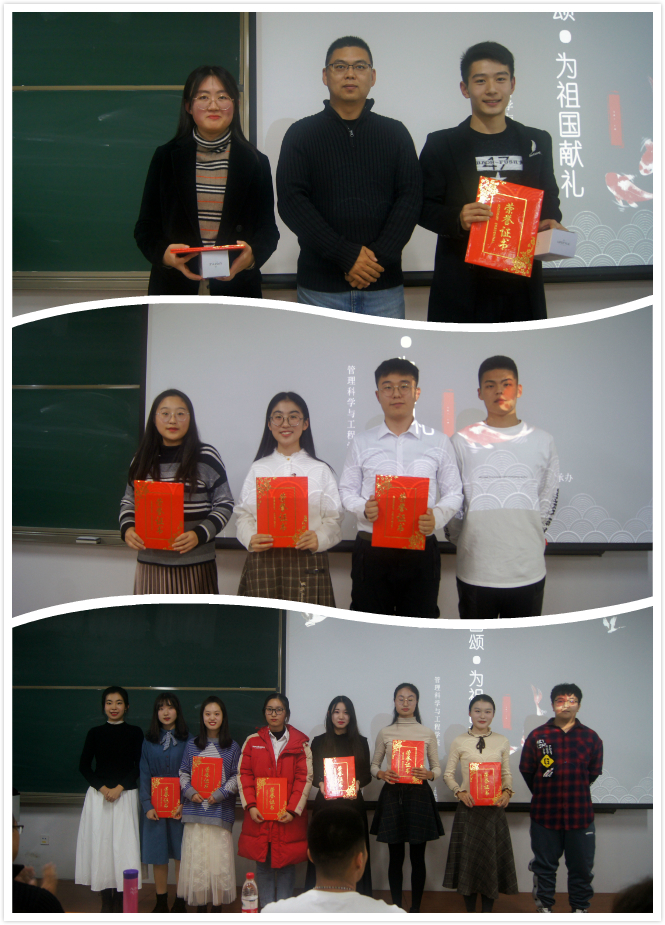 为了弘扬爱国主义,传承爱国情怀,丰富校园生活,提高艺术修养,11月26日晚,我院组织了“国颂·给祖国献礼”—朗诵比赛的决赛。经过层层筛选,最终有11组选手进入决赛现场。本次比赛得到了广大老师领导和学生干部的关心和支持,出席比赛的评委嘉宾有18级辅导员孙智凝老师,管科院主要学生干部以及艺术团主要成员。