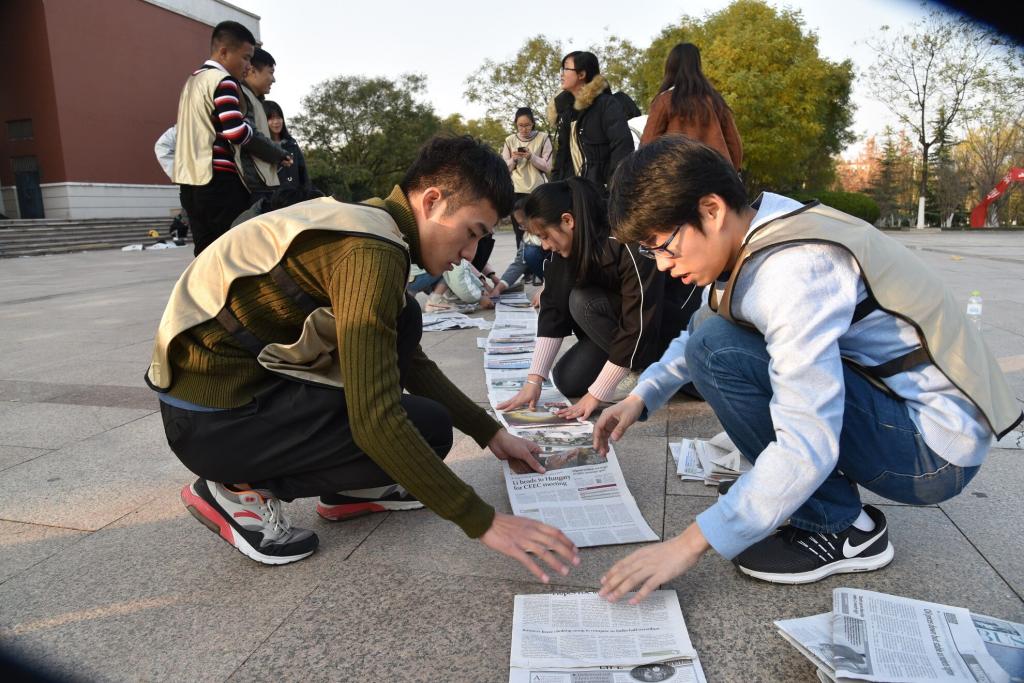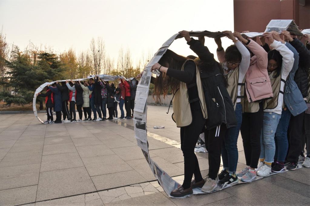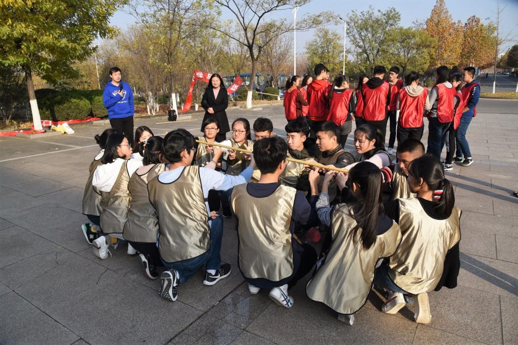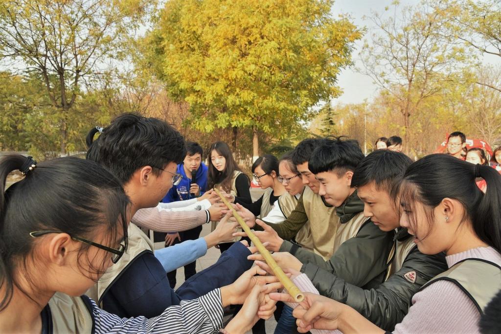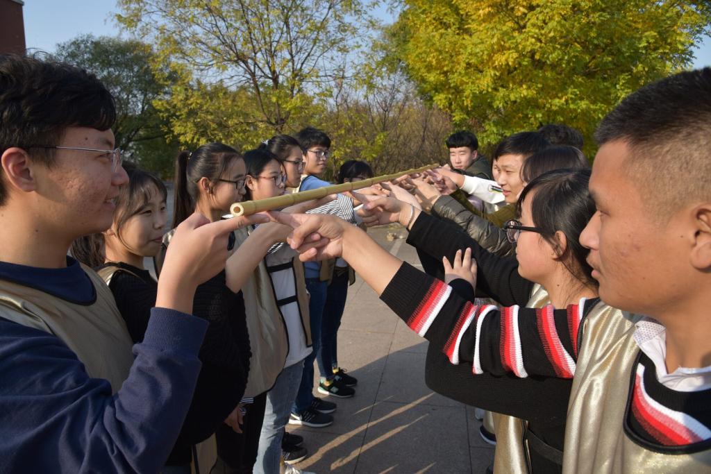 由本次拓展教练沈健老师介绍过拓展的起源后,拓展活动正式开始。首先通过“滚雪球”项目帮助团队内成员彼此熟悉,建立初步信任。活动分两队展开,通过短暂而又热烈的讨论,各队确立队名,队长及团队口号,并进行了团队展示。第一个活动“同心竿”正式开始!这个项目考验的是队友之间的协调配合,需要彼此间足够信任。在教练老师的引导下,双方队员展开激烈角逐,期间看到了学生有埋怨,有气馁,但也有彼此的鼓励,包容,共进退。最终,两队都先后完成了第一个项目。进行过团队成员彼此的分享之后,便开始了第二个项目——“风火轮”的角逐。两队队员首先利用一张张报纸和订书钉制作供团队行进的履带,制作完成后还要不断测试不断改进履带的实用性。最终经过反复地讨论与尝试,两队都顺利完成了制作,并在规定时间内利用自制履带帮助团队全体成员顺利到达了指定地点。