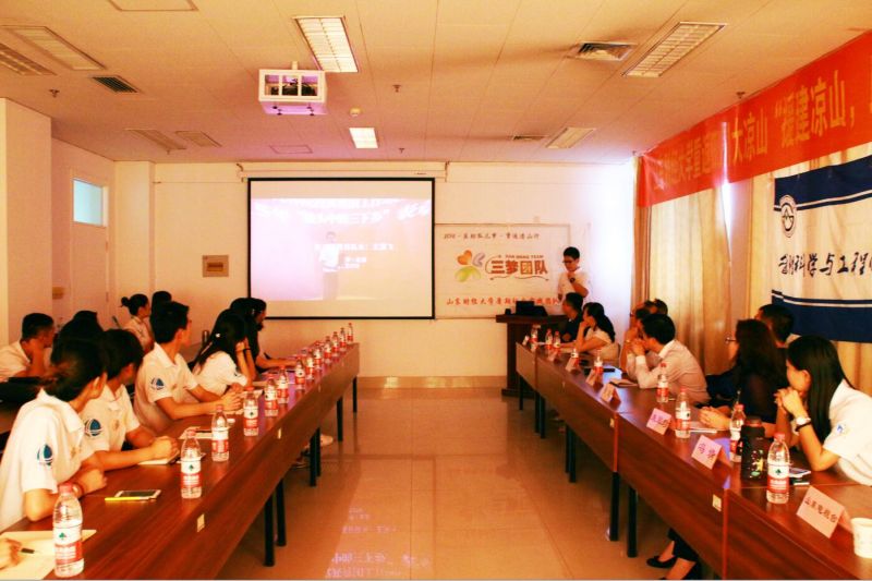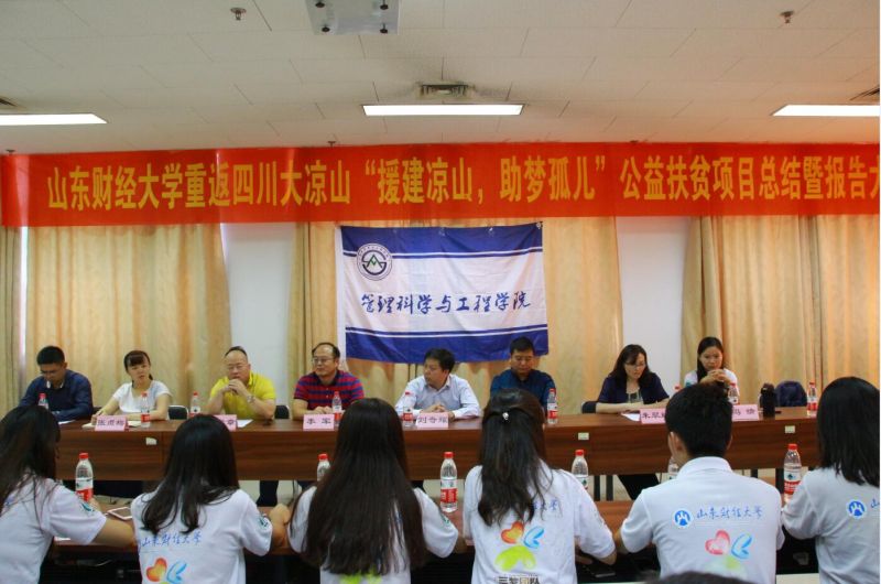 2016年9月21日上午10时,山东财经大学管理科学与工程学院“三梦”公益实践团队重返四川省凉山彝族自治州“支援凉山建设,助梦彝族孤儿”第四期项目总结暨报告会于燕山校区逸夫楼610成功举行。本次报告会由管理科学与工程学院党总支副书记朱翠珍主持,山东财经大学校团委书记刘奇耀,管理科学与工程学院党书记李军、团委书记张贞梅、辅导员孙智凝和冯婧以及爱心企业代表和山东电视台媒体记者出席,“三梦”公益团队全体队员参与。