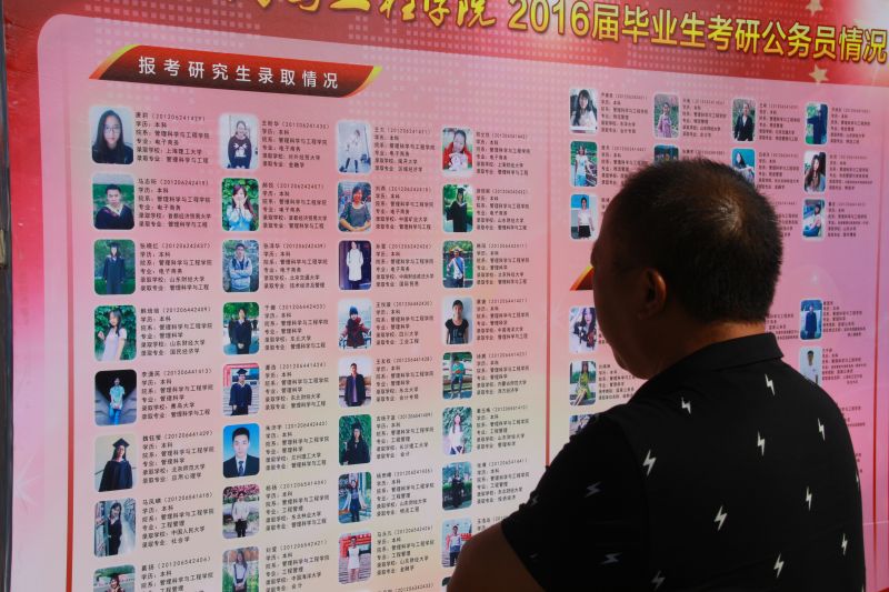 一名新生家长正在参观我院展板,了解我院优秀毕业生情况