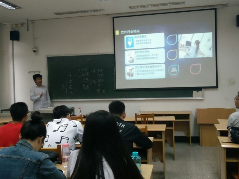 马京旺给同学们介绍了软件行业良好的就业前景、软件行业特点以及相关的分支领域,让同学们对软件行业有了进一步认识,同时鼓励大家进入软件行业。李训潮重点给同学们分析了面试应做的准备工作,并给出了面试、简历制作方面的一些建议。李训潮重点强调在无领导小组讨论中要有团队意识,语言简洁;简历不要使用QQ邮箱,并详细描述自己的实习经历和感受体会。