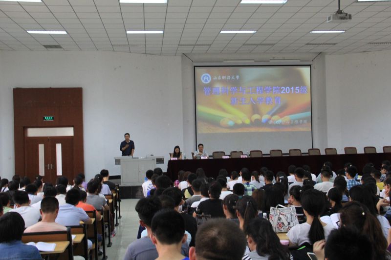 2015年9月9日上午8:30分,管理科学与工程学院2015级新生入学教育大会在山东财经大学明水校区5201教室隆重召开。党委秘书周广春、14级辅导员孙智凝、15级辅导员樊庆臣、冯婧,以及2015级全体新生参加了大会。