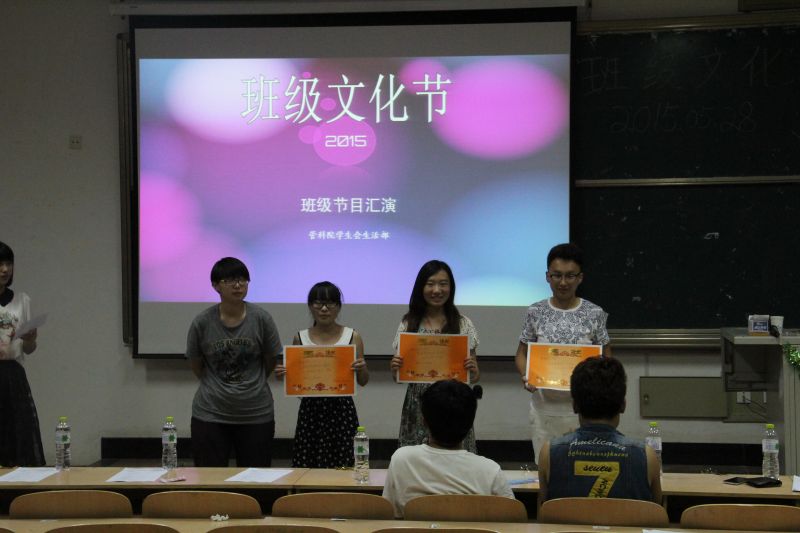 除了各班的精彩表演之外,本次活动也插入了游戏互动环节,为紧张的比赛注入了活跃的气氛。各班表演结束后,生活部成员在大屏幕上播放了各个优秀宿舍的幻灯片,给各个雅舍颁发了奖状。公布成绩后,由到场的评委为获得班级文化节一二三等奖的班级颁奖并做总结。最后,本次活动在阵阵掌声中圆满结束。