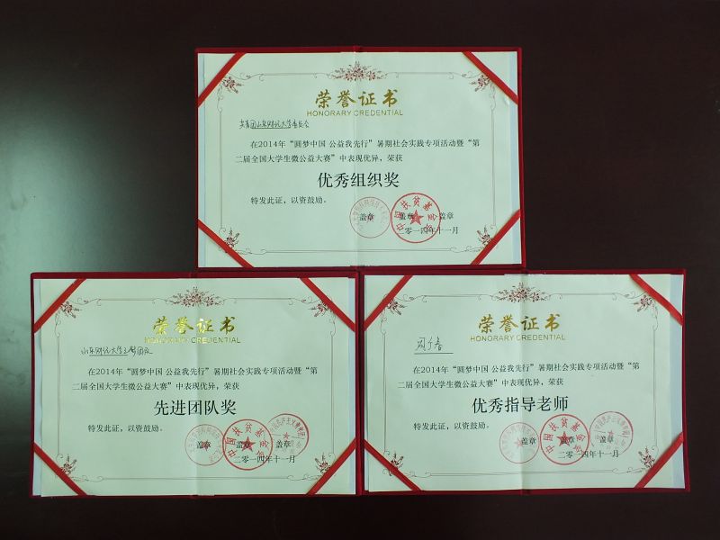 由我校管理科学与工程学院组建,数学与数量经济学院等学院参与的“三梦团队”入选全国百强团队,获“先进团队”荣誉称号,山东财经大学团委被授予优秀组织奖,指导教师周广春获“全国优秀指导教师”荣誉称号。该团队由管理科学与工程学院学生于2013年创建,在2013年“圆梦中国,公益我先行”专项社会实践暨第一届全国大学生微公益大赛入选全国百强团队并荣获“先进团队”荣誉称号,校团委荣获优秀组织奖,也是团中央“圆梦中国”专项社会实践活动中唯一一支连续两年获得百强团队、先进团队和优秀组织奖的队伍,为我校树立了一支专项社会实践的品牌。