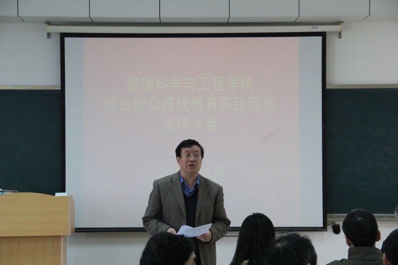 李玉成介绍了学校党的群众路线教育实践活动开展情况,对管理科学与工程学院党的群众路线教育实践活动开展以来取得的成果表示了肯定,并对下一步的工作提出工作要求。李玉成指出根据中央、省委和学校党委的部署,管理科学与工程学院从2013年8月到2014年1月开展了群众路线教育实践活动,学院党总支班子成员专题开会研究教育实践活动方案,成立领导小组,精心组织安排教育实践活动工作,严格落实上级部署要求,认真做好学习教育、听取意见;查摆问题、开展批评;整改落实、建章立制三个阶段的工作。结合实际工作,通过群众路线教育实践活动促进了党建和思想政治工作,加强了党组织建设和干部队伍建设,为学院在博士点建设、学科与科研、教学管理、学团工作等方面取得较好的成绩打下坚实的基础,使党的群众路线教育实践活动真正落实到实处,收到显著效果。希望学院按照校党委的工作部署抓好群众路线教育实践整改落实工作,对照学校、学院整改方案,进一步明确目标要求、理清工作任务、分工协调配合,逐项抓落实,确保整改落实和建章立制等工作取得实效。