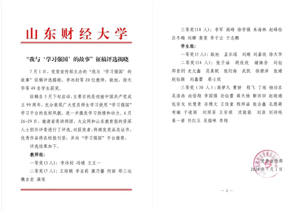 近日,学校党委宣传部主办的“我与‘学习强国’的故事”征稿评选落下帷幕。经山东省委讲师团、大众网和山东教育报专家评选,教师组全校20名教师获奖,其中一等奖3名,二等奖7名,三等奖10名。我院教师冯婧、何丽、李军分别荣获一、二、三等奖。