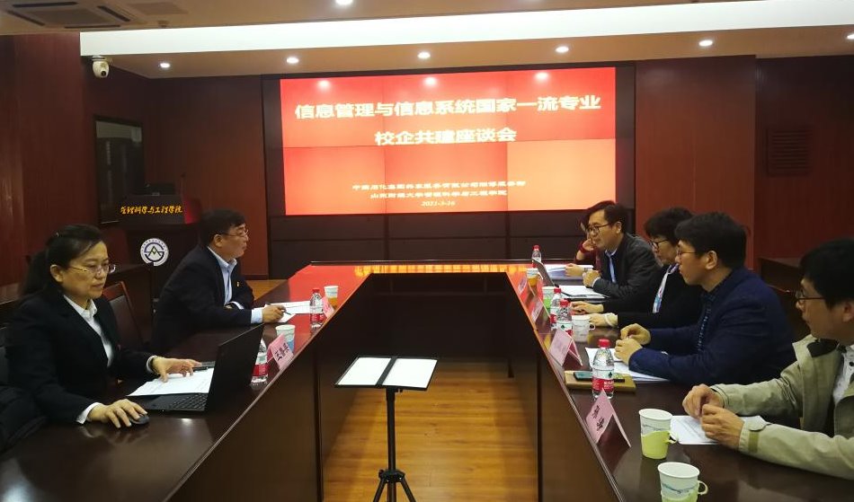 3月16日,信息管理与信息系统系(以下简称信管系)在逸夫楼621学术报告厅,与来访的中国石化共享服务有限公司淄博服务部经理孟祥峰、公司财务专家王鲁英召开了校企共建专业座谈会,学院陈浩副院长主持座谈会,信管系主任刘政敏、副主任张戈和部分专业老师参加座谈。