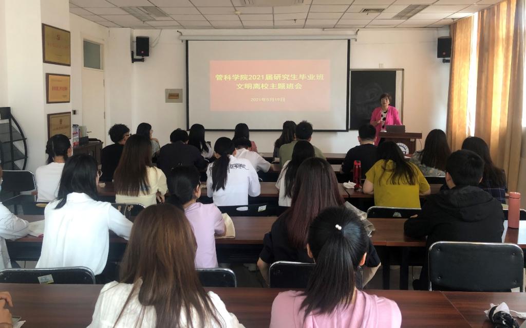 5月19日上午,我院先后组织召开研究生应届毕业生安全离校主题班会和在校生安全教育主题班会,会议均由团委书记兼研究生辅导员何丽主持,党委副书记崔东峰、学院全体应届毕业研究生以及管理科学与工程和物流工程与管理全体同学参加了会议。