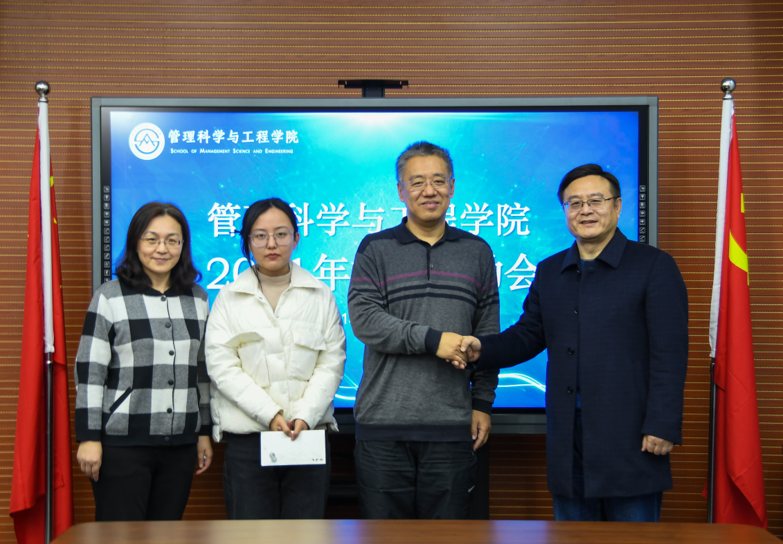12月20日下午2:00,我院在圣井校区6434教室举办2021年度91信息校友助学金资助仪式。校友代表山东财鑫通企业服务有限公司董事长赵学刚,学院党委书记李军,党委副书记朱翠珍,部分辅导员和获资助学生2020级卓越班马晨曦参加仪式。此次仪式由朱翠珍主持。