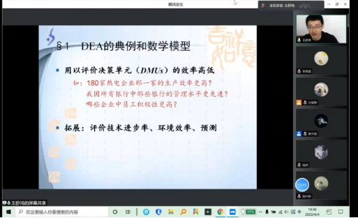 王舒鸿教授采用PPT讲解与画图软件模拟相结合的方式,将需要在黑板上演示的公式、图形等做成动画的形式,不仅提升了学生听课过程中的注意力,也有助于学生加强对概念和定理的理解。王老师的《多元统计分析》课,不仅包括经典的模型方法的,还与当前国际国内热点问题相结合,如分析“俄乌”局势、预测新冠疫情、判别影响因素等,将这些方法落地落实,真正让学生们在“干中学”,更深刻的理解书本中经典模型方法的应用。,课堂上,同学们有问题及时打断,随时提问,,老师也真正做到有问必答,学生们学习的热情空前的高涨。