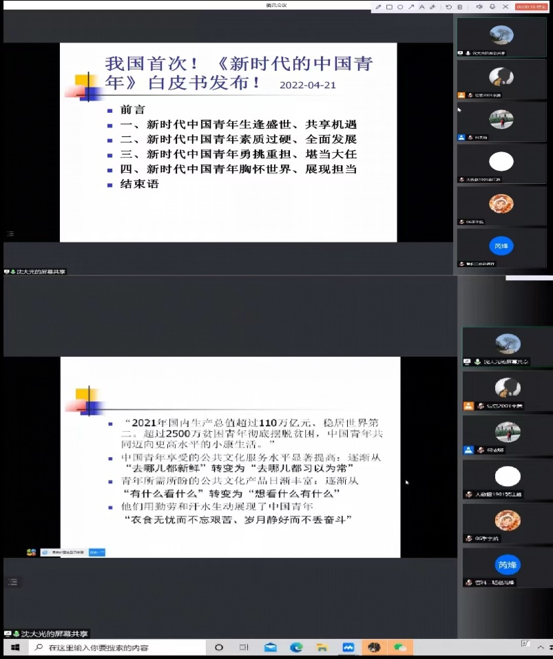 会上,沈大光以白皮书的目录结构为出发点,分别从中国青年所处的社会环境、整体素质、当下作为与未来使命四个方面展开论述。其中,沈大光重点强调“新时代中国青年生逢盛世、共享机遇”这一论题,认为当下青年人所逢的盛世正是供给我们施展才华、大展宏图的时代。会上,沈大光深入浅出地分析阐述党的十六大以来不同阶段党和国家建设的主要任务,回顾了从最初的建设小康社会,到建成再到全面建成小康社会目标的演变过程,并展望未来,憧憬即将召开的二十大。沈大光还对当下中国所处的百年未有之大变局进行了阐述,他结合历史与现实,阐明中国人民的不断探索印证着中国社会主义道路的必然性与优越性。