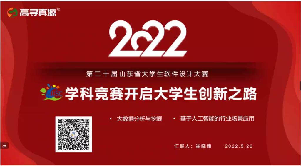 5月26日下午2:30,为激发我院学子对于参与软件设计类赛事的热情,提升同学们对于大学生软件设计大赛的认识,我院特邀请高寻真源教育科技有限公司市场部主管崔晓楠带来以《学科竞赛开启大学生创新之路》为主题的讲座。应疫情防控要求,讲座以线上方式进行,由我院管理科学与大数据系主任王高山老师主持,我院大数据专业师生及有意向参赛的同学与会。