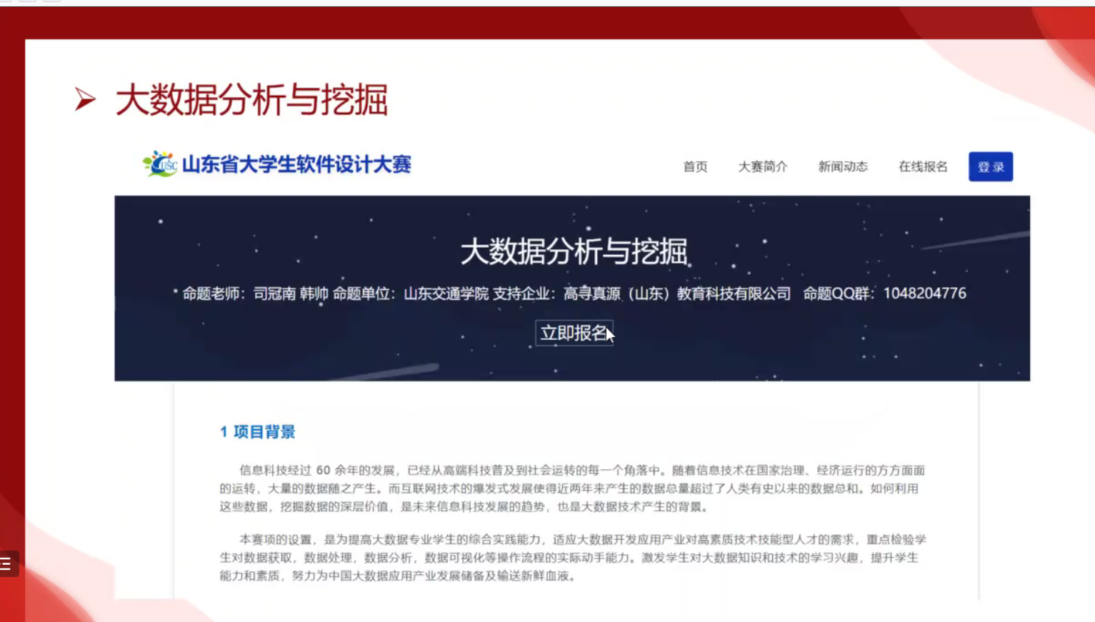 本次讲座所聚焦的第二十届山东大学生软件大赛与我院大数据管理应用专业相契合,为大数据专业学子提供了锻炼自己的机遇与展现自己的舞台。本次讲座有助于激发学生对大数据知识和技术的学习兴趣,鼓励同学们积极挑战自己,提升自己的能力与素质,从而促进学院为中国大数据应用产业输送新鲜血液。