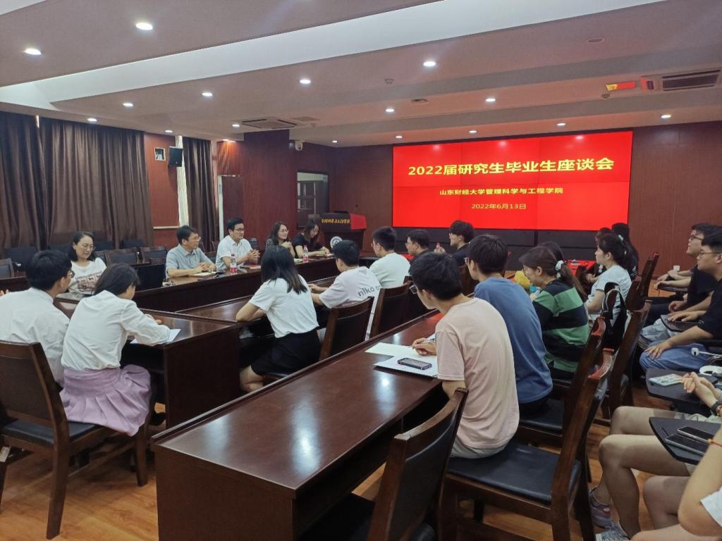 6月13日下午,我院2022届研究生毕业生座谈会在逸夫楼Y621召开。会议由学院党委副书记朱翠珍主持,院长刘位龙、副院长刘政敏、团委书记何丽、教学秘书王娅姿及2022届部分博士、硕士生代表参加了座谈会。