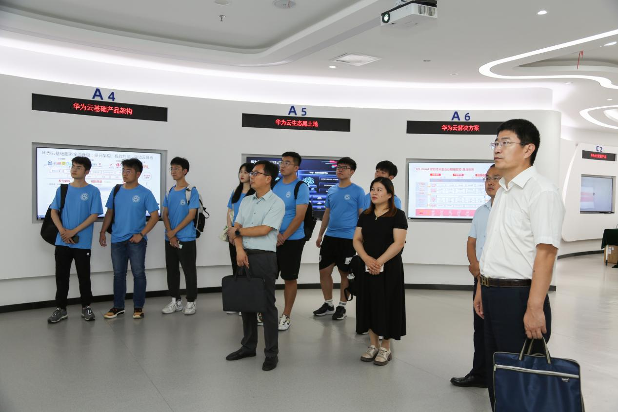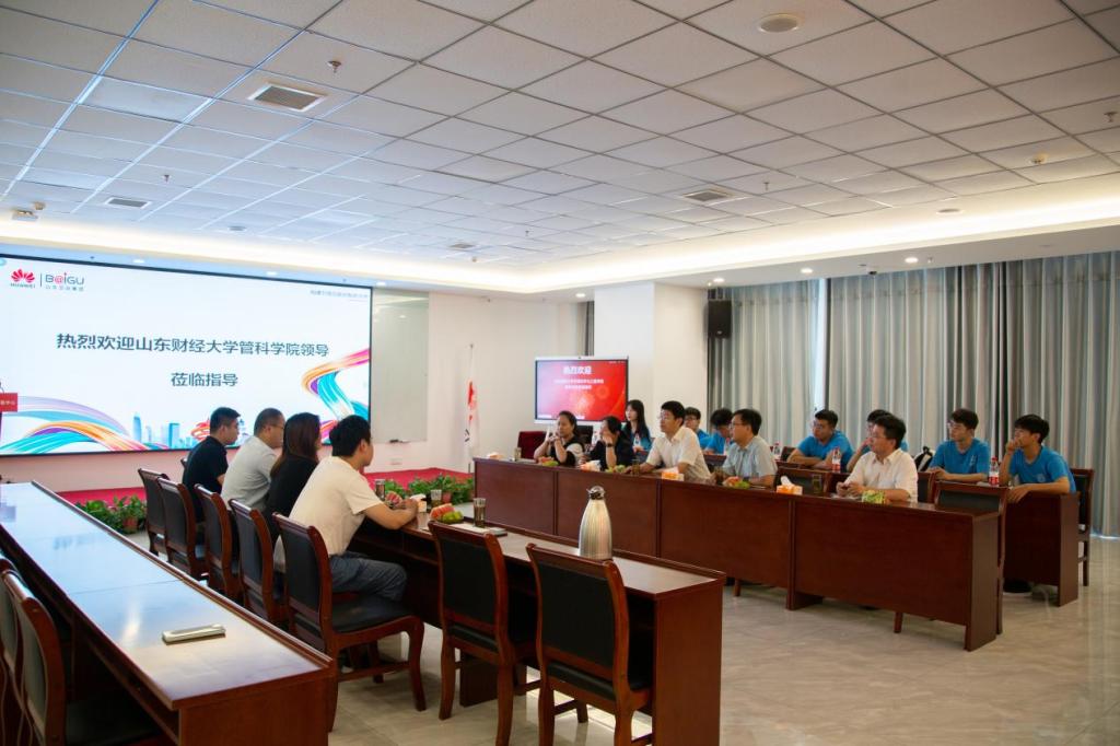 山东百谷信息技术有限公司副总经理关翠翠陪同调研团队参观了“华为云联合创新体验中心”,对企业的基本信息和能力业务进行了详细的介绍,并对华为云赋能山东省企业数字化转型的典型案例进行了分享。随后技术部负责人就企业与华为的合作和企业对推进企业数字化转型做出的努力与成果进行介绍。负责教育部门的负责人向学院领导与同学们讲解华为与高校合作的决心,希望通过华为帮助同学们学习新一代信息技术,提高学生本身硬实力,强调教育是国家发展的未来。