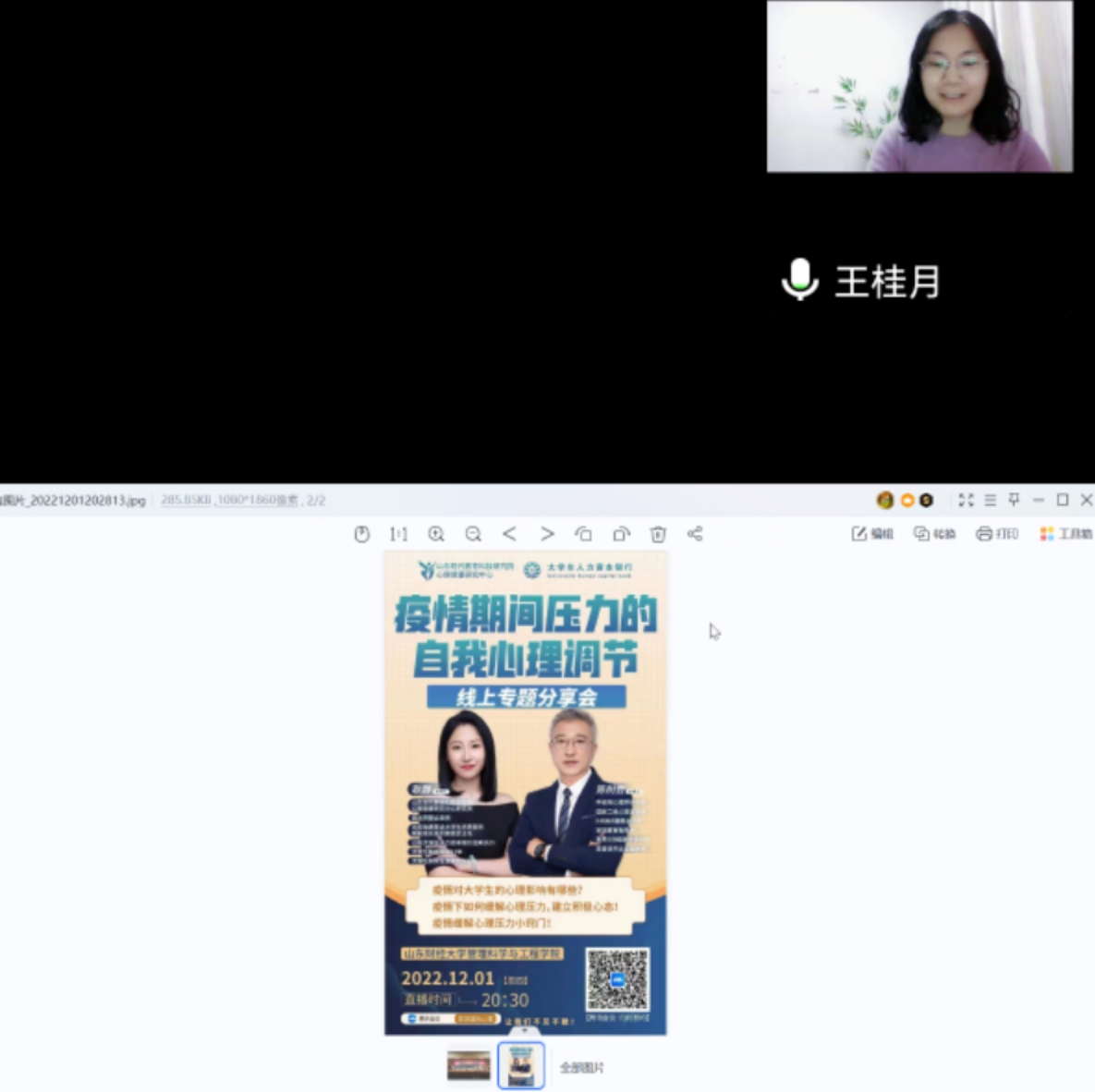 在当前疫情形势下,为让我院师生能以更加阳光积极的心态来应对疫情压力,继11月24日组织学生收看心理健康讲座之《我的幸福我做主》后,12月1日晚,我院再次开展心理健康讲座活动,本次讲座的主题是《疫情期间压力的自我心理调节》,邀请的主讲人是国家二级心理咨询师、家庭教育指导师、世界500强资深培训师陈树会先生,山东现代教育科技研究院心理健康研究中心研究员耿静女士担任嘉宾,讲座由学工办主任王桂月主持,师生通过腾讯会议观看了讲座。