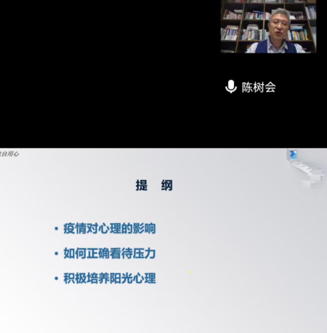 陈树会先生首先分析了疫情对大学生的心理影响,通过提出九个简单问题来帮助大家判断压力,用一种通俗易懂的方式来让同学们明晰压力的定义,同时告诉大家可以通过压力的唤醒状态来给压力分类,进而告诉大家如何正确对待压力。并从五个方面来讲述疫情形势下如何缓解心理压力,养成阳光积极心态。