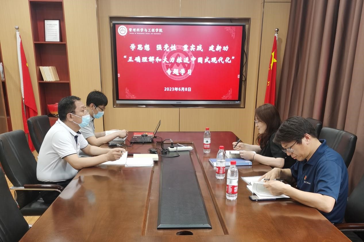 6月8日至9日,管理科学与工程学院学习贯彻习近平新时代中国特色社会主义思想主题教育读书班开展第四专题学习。学院班子成员以高度的思想自觉和行动自觉,通过集中学习、自主学习、交流研讨等多种形式,牢牢把握“正确理解和大力推进中国式现代化”这一主题,深入学习这一党的重大理论创新和最新理论成果。