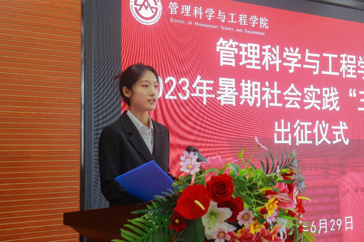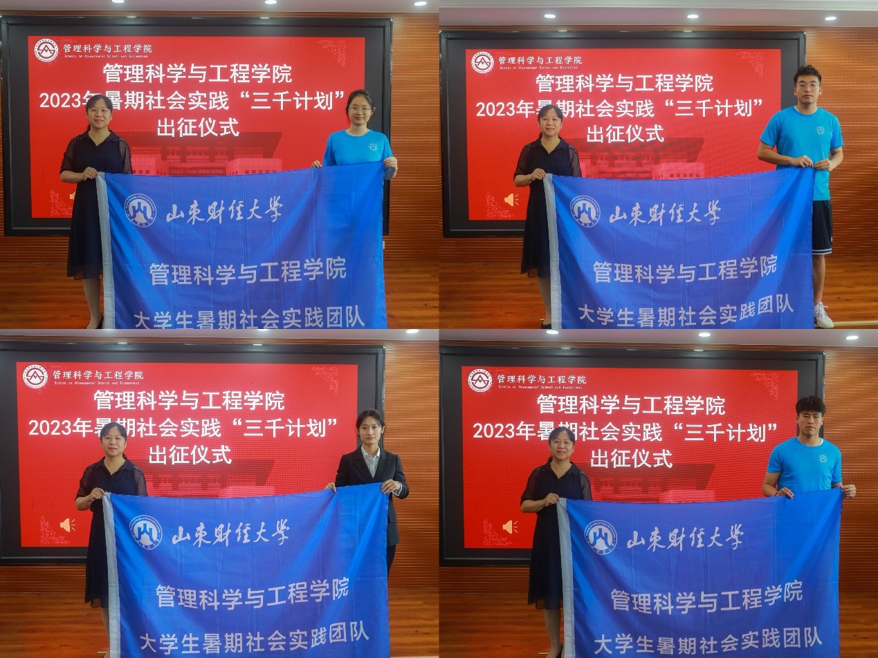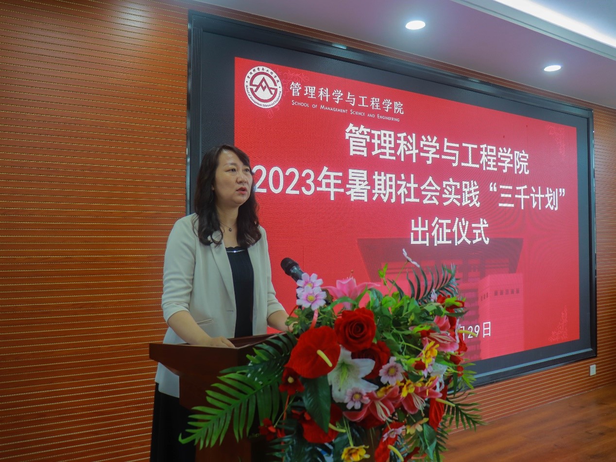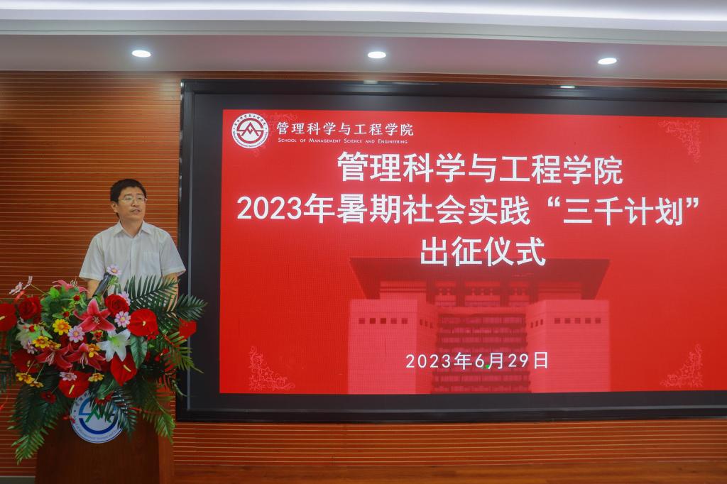 6月29日下午,我院在圣井校区6432报告厅举行了2023年暑期社会实践“三千计划”出征仪式。学院党委书记徐世星,副书记吕晓燕,学院团委书记何丽,学工办主任王桂月,就业办主任孙智凝,学院党委专职组织员冯婧,辅导员邹冲、张智璇等领导老师出席,管科学院社会实践活动“三千计划”校级重点团队及校级专项团队负责人参加,本次活动由辅导员满宠主持。