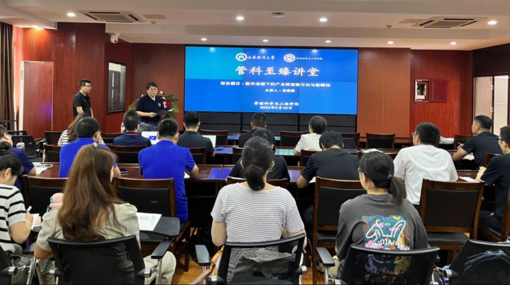 9月10日上午,管理科学与工程学院在逸夫楼621举行了管科至臻讲堂(研究生系列讲座第2期),邀请了浪潮通软高级架构师岳现国和山东省数据要素创新创业共同体首席专家刘心田分别开展了“数字浪潮下的产业转型新方向与新路径”和“数据要素价值挖掘的共同体实现路径”的专题报告。报告会由副院长刘政敏教授主持,学院师生60余人参加了报告会。