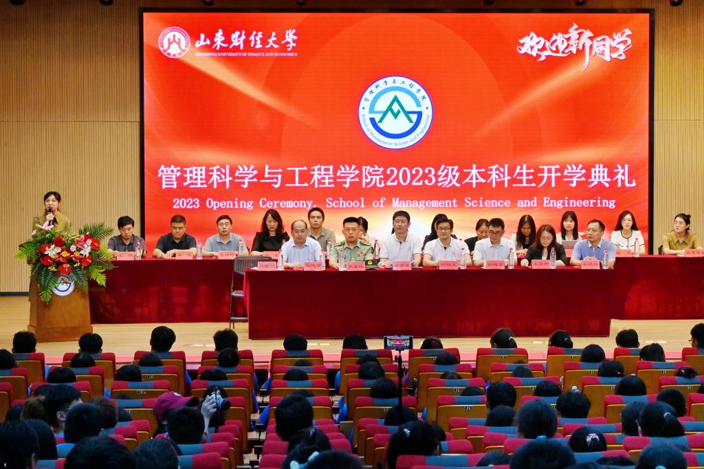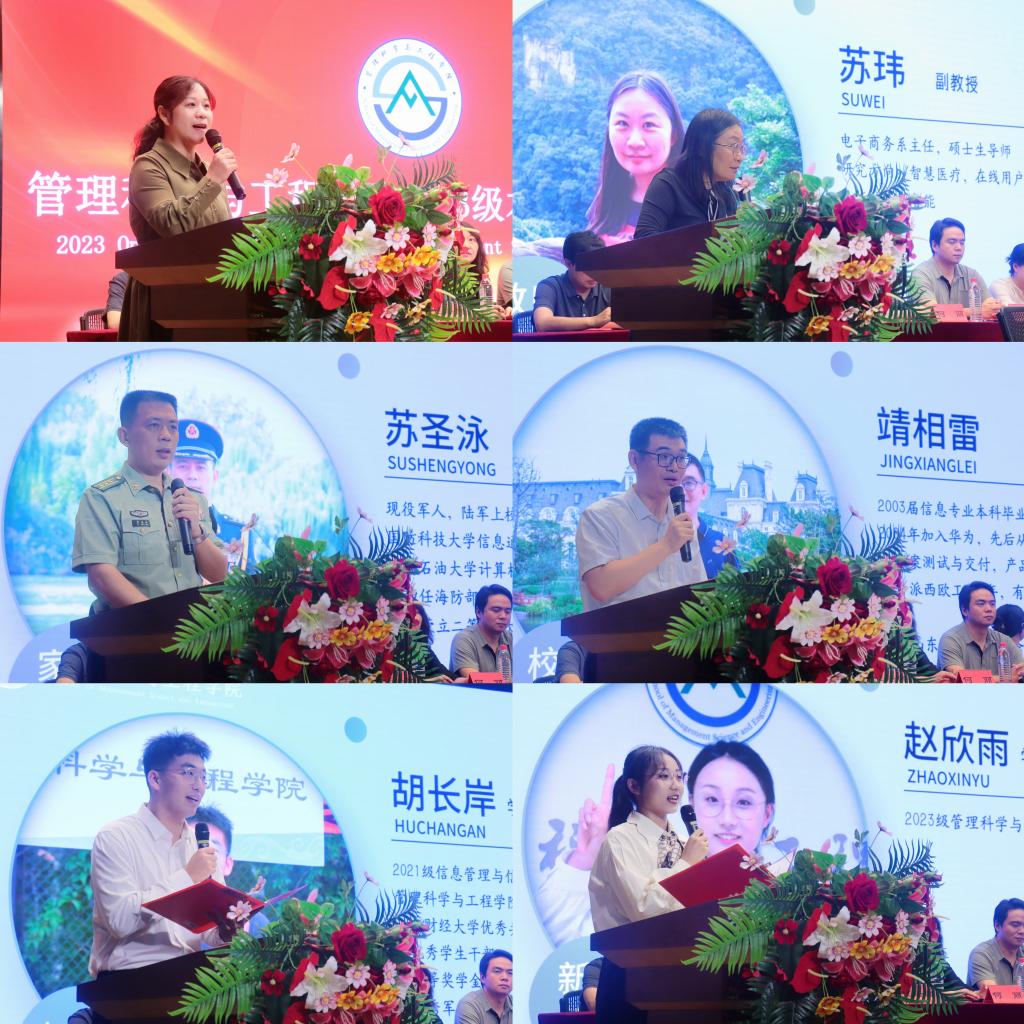 教师代表、电子商务系主任苏玮勉励同学们要努力积累专业知识,锻炼思考问题的能力,成为社会的中坚,民族的栋梁,国家的希望;校友代表、2003届信息专业毕业生、华为山东区域5GtoB服务经理靖相雷回顾自己的大学时光,与同学们分享了他大学毕业前后的三段个人经历。他鼓励同学们把知识学习和项目实践相结合,做到有恒心,有目标,有方法,不畏困难挑战,成为时代所需的复合型人才;在校生代表2021级胡长岸结合自身的经历劝勉大家端正自己的学习态度,寻找正确的学习方法,坚守"厚德博学,创新自强"的院训,去探索未知的旅途,去创造无限的可能;2023级新生家长代表、陆军上校苏圣泳首先表达了对学院和老师衷心地感谢,他希望同学们能够在接下来的四年里培育位卑未敢忘忧国的家国情怀,铁马冰河入梦来的责任担当,咬定青山不放松的奋进精神和报答春光知有处的感恩之心;2023级管理科学与工程类5班赵欣雨代表全体本科新生发言,她表示将会勤于奋斗,善于感恩,勇于担当,永葆年轻人的朝气和锐气,奔赴美好未来。