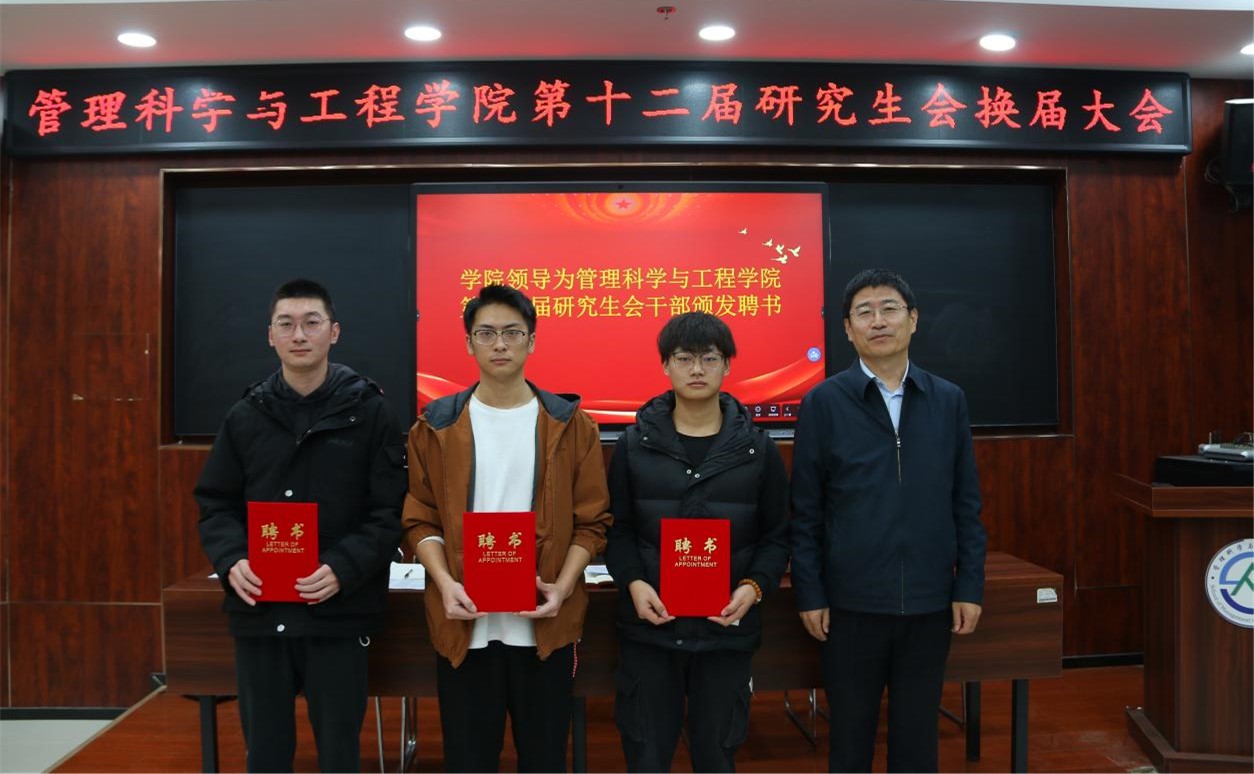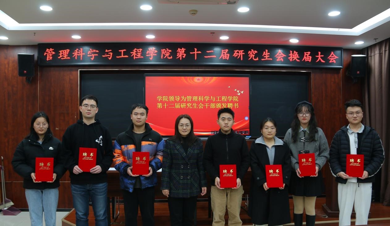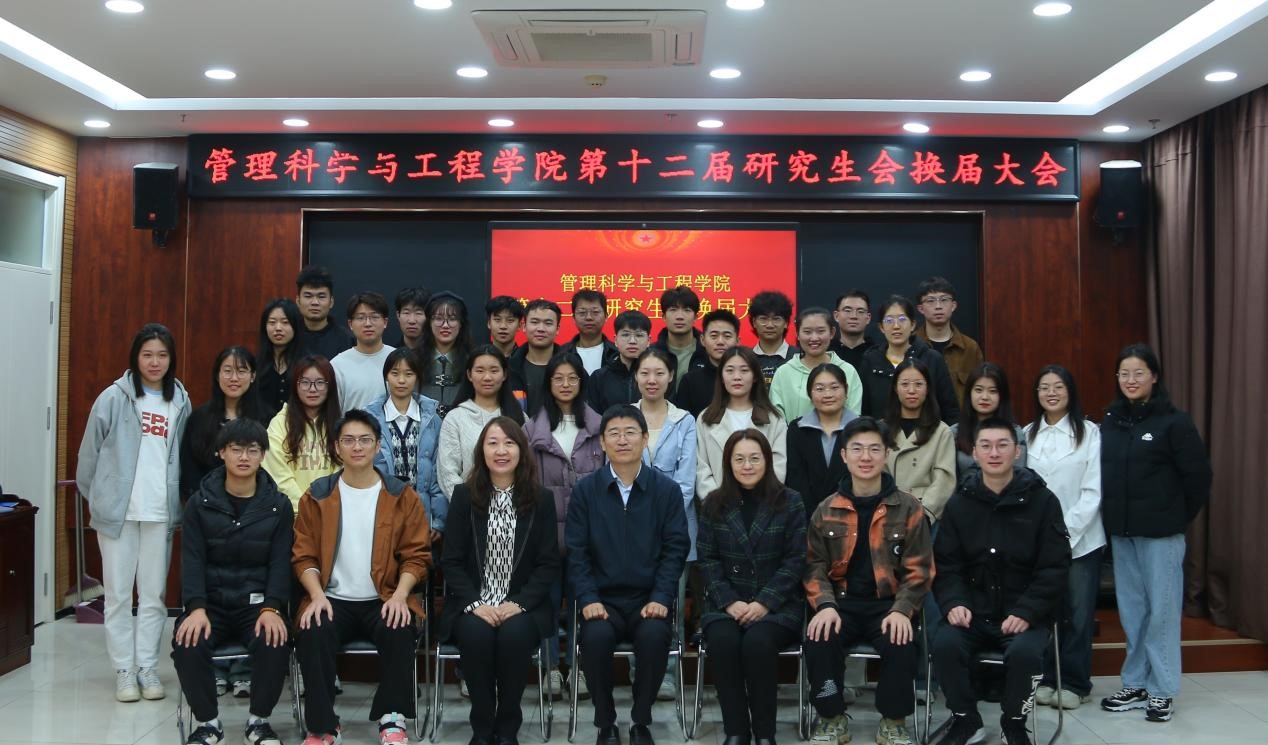 11月22日,管理科学与工程学院第十二届研究生会换届大会成功召开。学院党委书记徐世星、党委副书记朱翠珍、团委书记兼研究生辅导员何丽,两届研会成员参加,会议由朱翠珍主持。