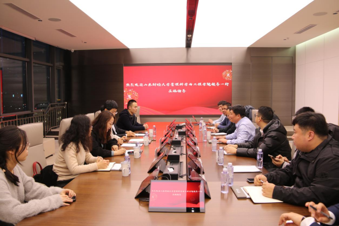 参观后,双方进行了深入的交流。徐世星介绍了本次调研的目的,对双方合作,打造协同创新的双赢格局表示期待。楚尊景对企业团队建设、自有产品能力进行详细介绍,通过实践案例突显数字孪生、物联网、大数据等新一代信息技术赋能医养健康领域的典型应用场景。张戈详细介绍了我院信管专业建设情况,对双方在智慧医养领域的人才培养、科学研究进行了展望。随后,双方进行了山东财经大学创新实践基地授牌仪式。