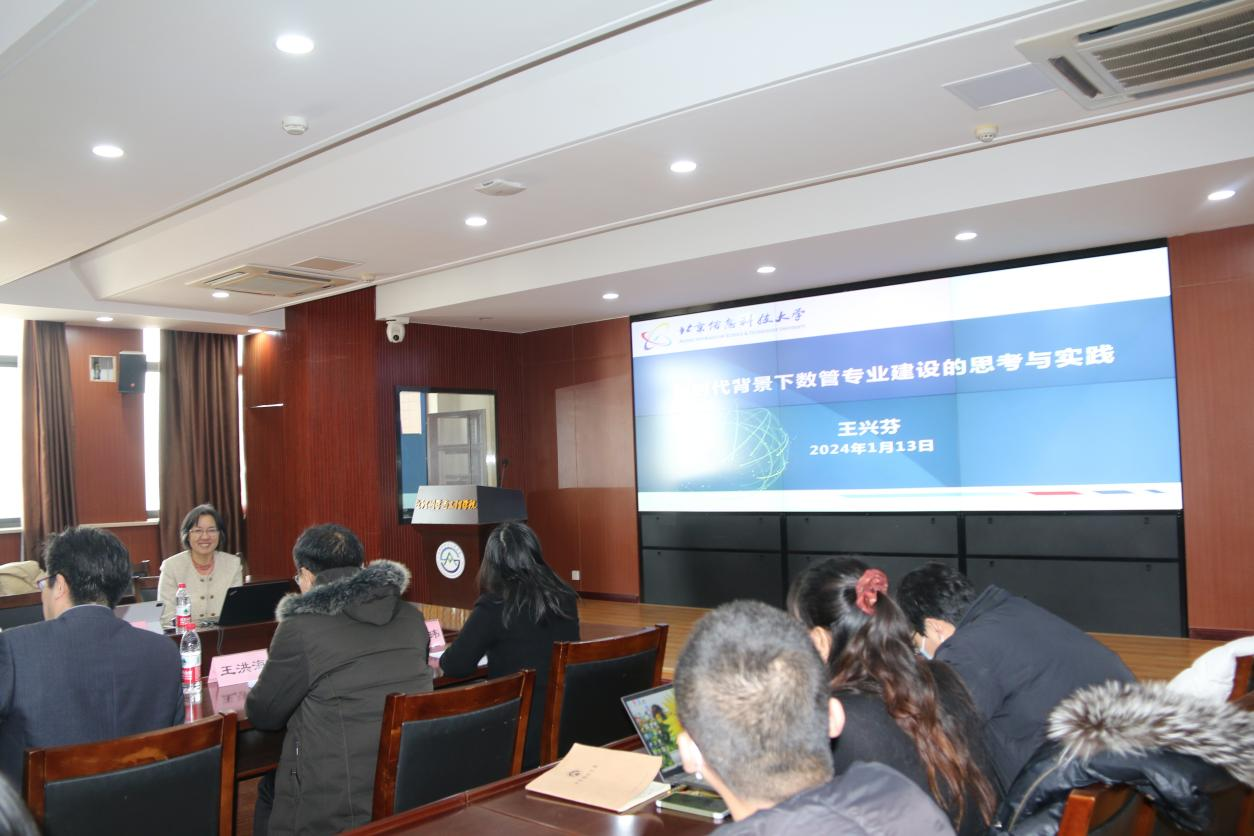 王兴芬教授做了题为“新时代背景下数管专业建设的思考与实践”的主题报告,介绍了新时代背景下,数管专业人才培养面临新的挑战和机遇,详细介绍了北京信息科技大学大数据管理与应用专业的建设实践。