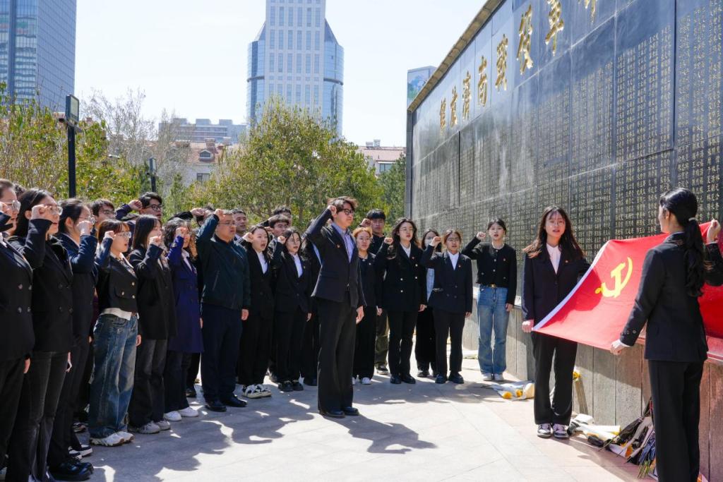 之后,在庄重威严的革命烈士纪念碑前,全体党员肃穆站立,面向党旗,重温入党誓词。宣誓完毕,学生党员代表向先烈敬献鲜花,向为民族独立、人民解放英勇献身的革命先烈表达崇高的敬意和哀思。
