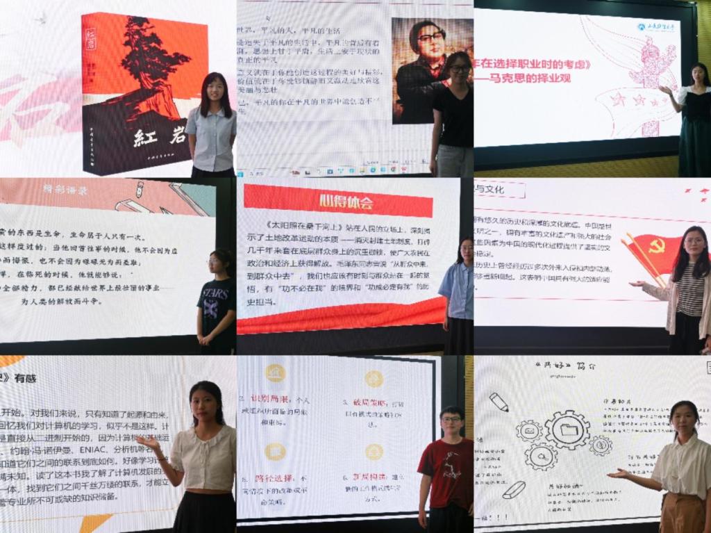 郭子仪分享的《红岩》充分展现了共产党人视死如归的大无畏英雄气概;胡晓慧分享的《平凡的世界》深刻地展示了普通人在大时代历史进程中所走过的艰难曲折的道路,让同学们更加珍惜今天的幸福生活;姜姝分享的《太阳照在桑干河上》表达了无论时代如何更迭,桑干河畔的人们仍坚韧不拔地生活在阳光下,在阳光普照中见证社会发展带来的变迁;彭楷雯带来的《红岩》道出了在面对困难时,共产党人坚定不移地守护国家和人民的信仰与坚持;张一帆带来的《平原枪声》讲述了抗日战争时期冀南平原地区军民团结一心、共同抗击外敌的英勇事迹;王园园带来的《为什么是中国》横跨百年历史,揭秘中国崛起内幕;祝艺玮带来的《钢铁是怎样炼成的》赞扬了青年人在血与火的洗礼中大无畏的革命英雄主义和乐观精神,以及在和平建设时期无私奉献精神和忘我的工作热情;奚瑞祺分享了《青年在选择职业时的考虑》后,结合自己的专业背景,深入思考了自己的职业理想和发展路径;曾鑫玥分享《计算机简史》后了解到计算机发展的曲折过程,是信管专业所不可或缺的知识储备;李美琪带来的《共好》向同学们介绍了一种激发组织激情和能力的革命性方法;夏铭生分享读了《跃迁:成为高手的技术》后找到了适合自己专业学习的方法。