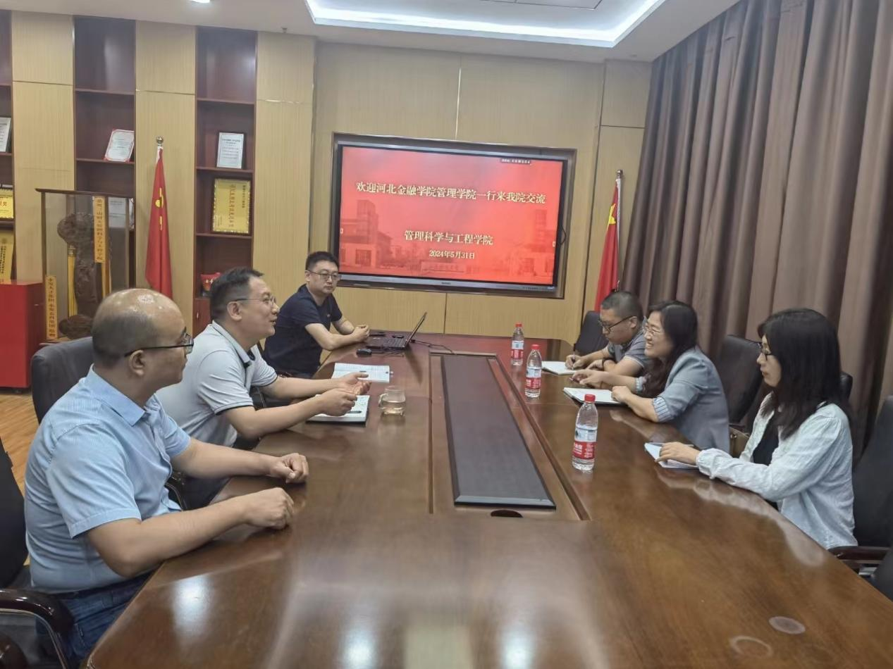 2024年5月31日下午,河北金融学院管理学院副院长于瑞卿带队来我院进行人才培养和专业建设方面的调研交流学习,学院副院长王洪海,大数据管理与应用系主任杨成伟、副主任王会东参加了本次调研座谈。