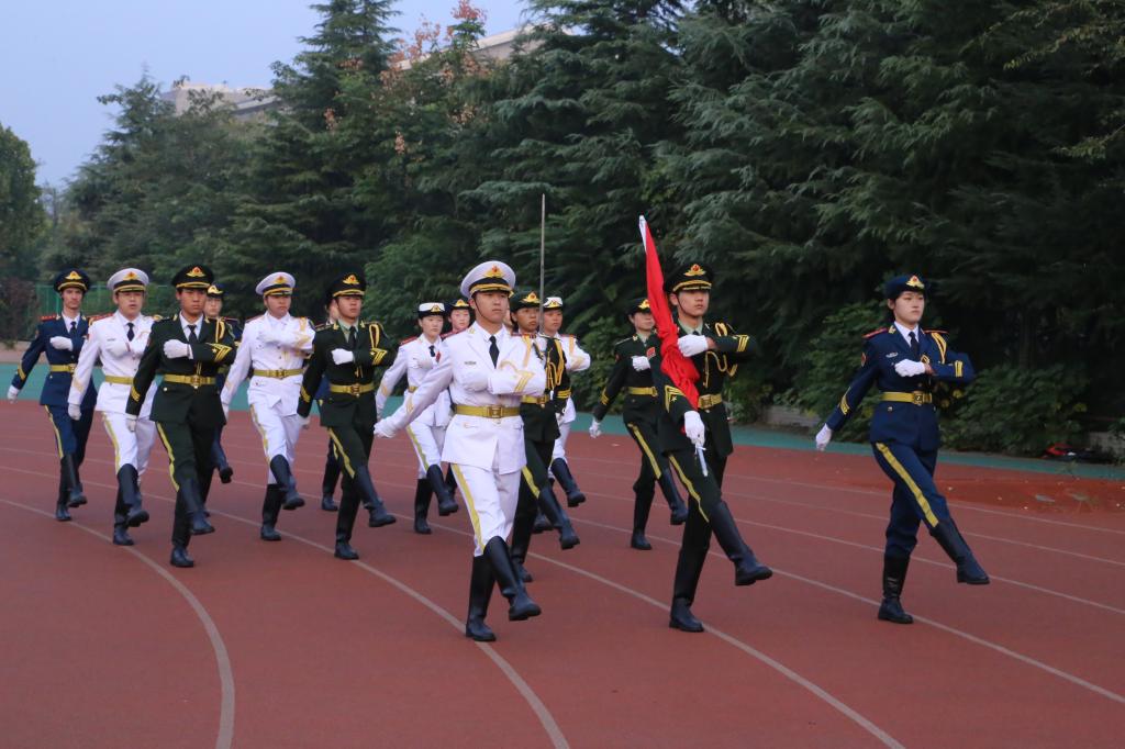 在雄浑壮丽的《红旗颂》中,庄严的升旗仪式正式拉开帷幕。山东财经大学国旗护卫队迈着矫健的步伐,护送着国旗稳步走向升旗台。微凉的晨光里,五星红旗在激昂的国歌声中徐徐升起,迎风飘扬。全场师生肃立凝视,目光中满含对国旗的敬仰与热爱。