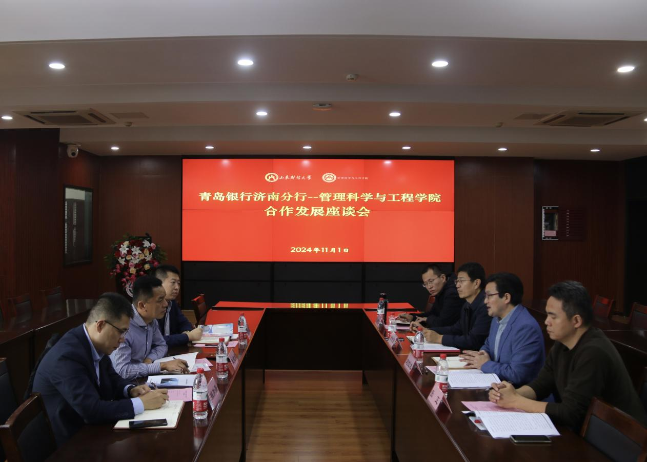 2024年11月1日,我院与青岛银行就合作发展事项举行座谈。青岛银行济南分行副行长王晓东、总行公司银行部经理黄伟光、济南分行营业部总经理臧加磊,我院党委书记徐世星、院长刘位龙、教师张正、王重仁参加座谈。座谈于燕山校区逸夫楼621举行。