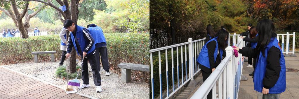 活动最后,大家开展了志愿服务活动。同学们仔细清扫落叶、擦拭栏杆、座椅、宣传栏等公共设施,以实际行动表达对革命先烈的敬仰与追思。