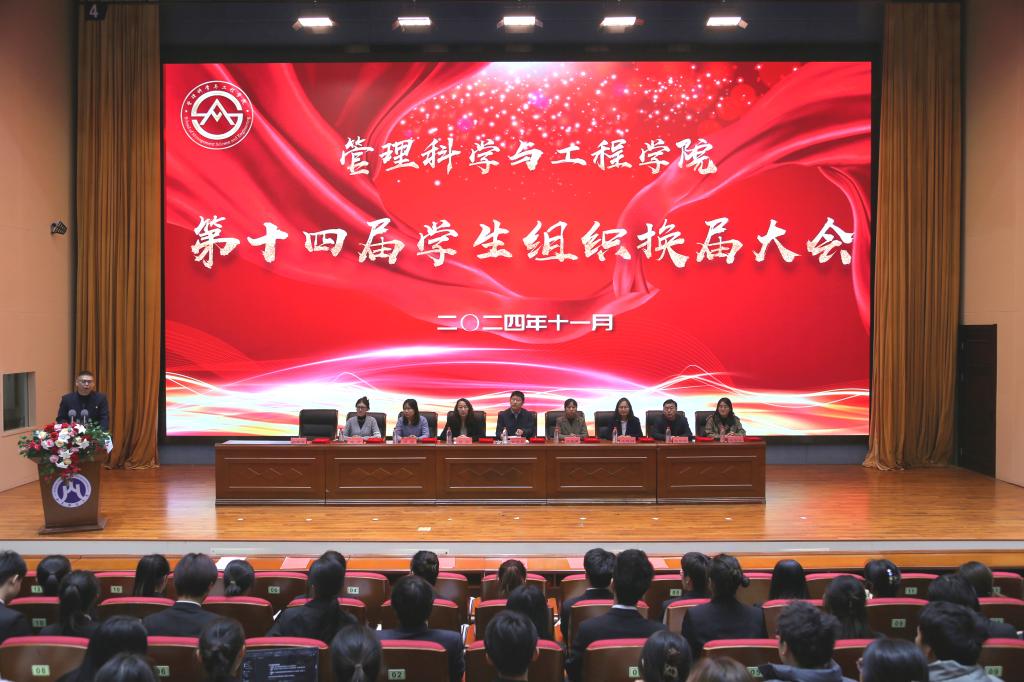 伴随着雄壮的中华人民共和国国歌,大会正式拉开帷幕。学院团委书记何丽介绍了第十四届学生组织的换届情况。吕晓燕宣读《管理科学与工程学院第十四届学生组织干部任命决定》,并向全体新任干部表示热烈祝贺。随后,学院领导和老师为新一届学生组织干部颁发了聘书。