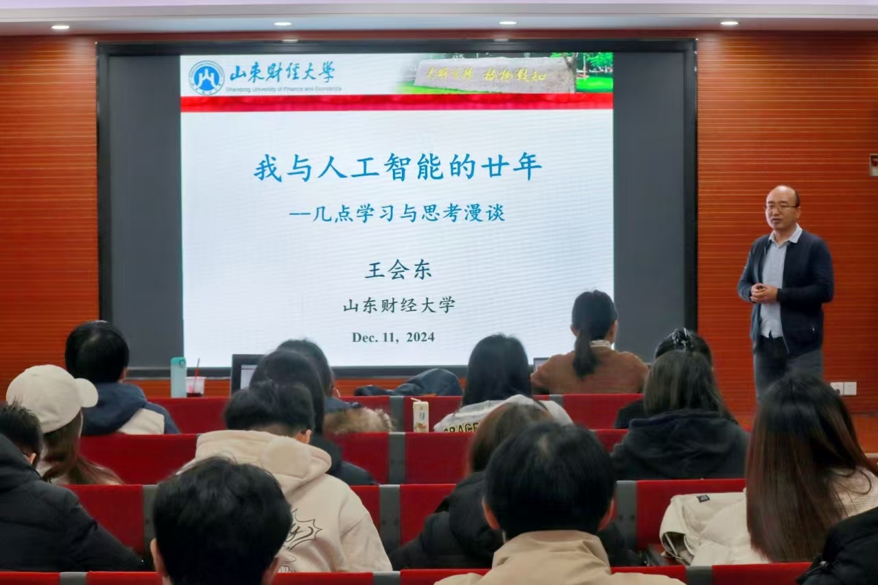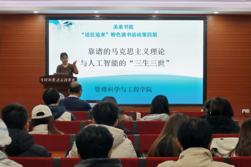 2024年12月11日,山东财经大学管理科学与工程学院圣泉书院在山东财经大学圣井校区会议室6432举办第四期“述往追来”特色读书会。本次活动主题为《马克思主义理论与人工智能的“三生三世”》,两位领读人分别为大数据管理与应用系党支部书记、系副主任王会东教授,以及学生第四党支部书记、“多触角两栖式”辅导员素质能力提升工作室主持人冯婧老师。大数据管理与应用专业2022级、2023级、2024级近六十名同学参加了本次读书活动。